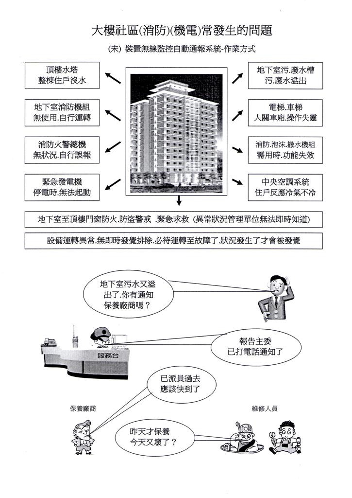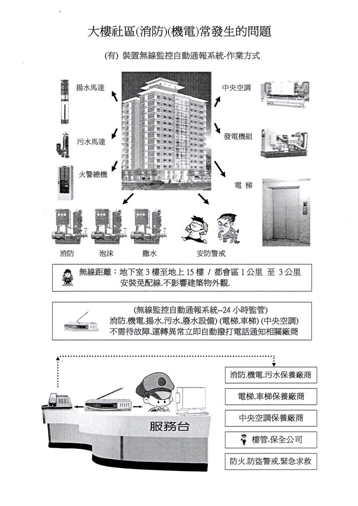 1對多-無線自動通報系統 : 替代人員24小時監控 消防.機電.污水.揚水.廢水.發電機.電梯.中央空調....各種設備運轉異常(無線通報管理人員或自動打電話通報各相關廠商)